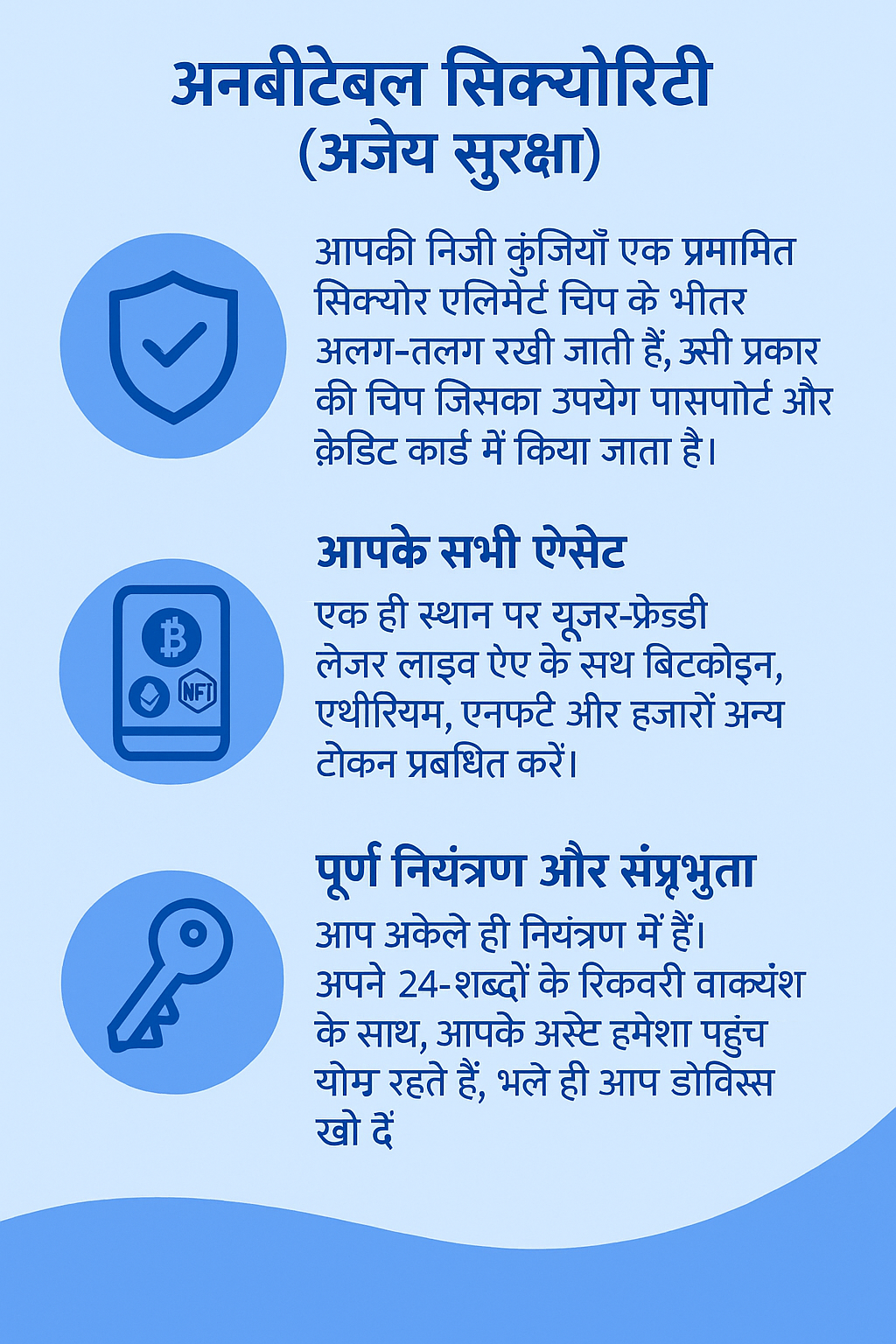 एक्सचेंजों पर अपनी संपत्ति को जोखिम में न डालें। एक अधिकृत स्रोत से सीधे और सुरक्षित रूप से भेजे गए एक वास्तविक हार्डवेयर डिवाइस के साथ अपने डिजिटल भविष्य को सुरक्षित करें।